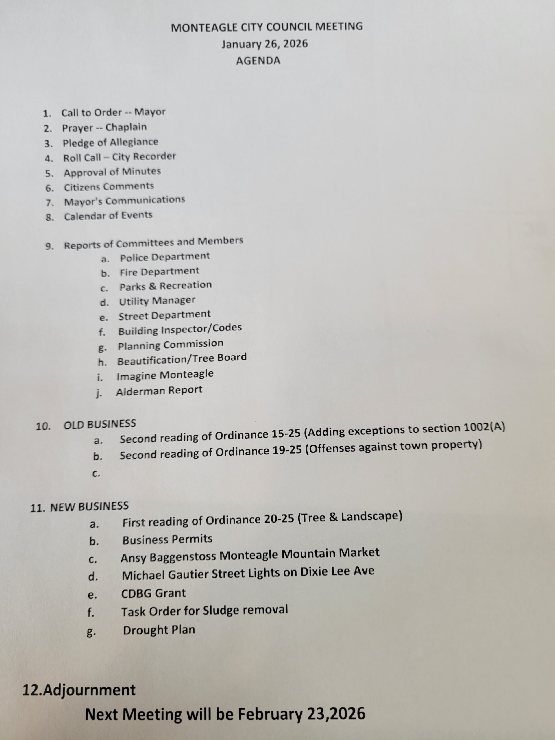 The Town of Monteagle will hold a special called public hearing on the Community Development Block Grant (CDBG) program on Thursday, Jan. 8, 2026, at 9 AM CST. The hearing will take place at Monteagle Town Hall located at 16 Dixie Lee Avenue, Monteagle, TN 3756. The meeting’s purpose is to discuss possible projects the town may apply for under this program. CDBG funds may be used for water and sewer improvements, immanent threat issues, and community livability projects. Anyone with disabilities requiring special accommodation for the meeting should contact the Town of Monteagle at 931-924-2265. The Town of Monteagle supports equal opportunity providers and does not discriminate based on race, sex, age, national origin or physical handicap.